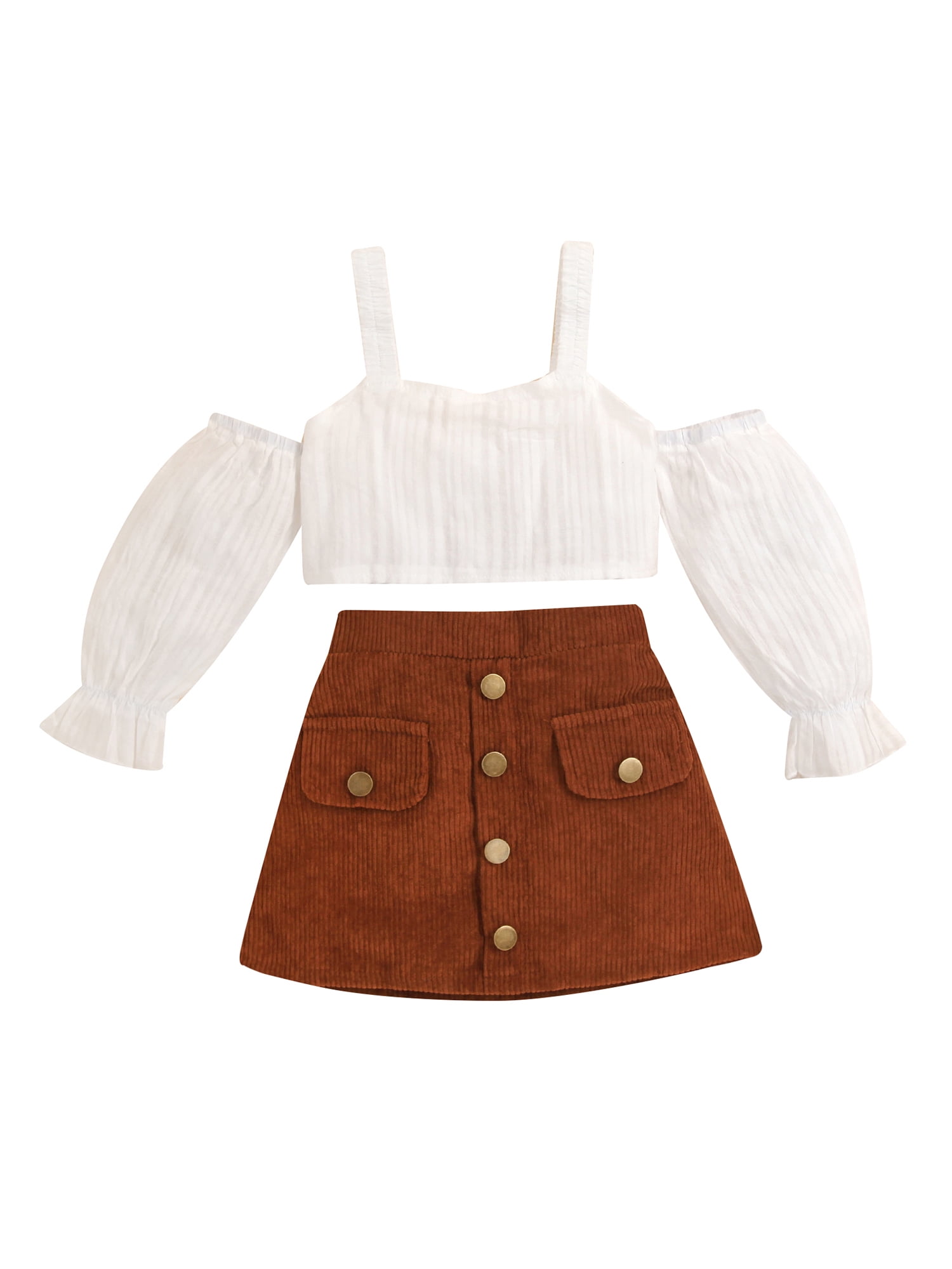 Xingqing 2pcs Baby Girls Clothes Spring Summer Set Long Sleeve Off Shoulder Tops Mini Corduroy Skirt Outfits Brown 6 7 Years Walmart Com